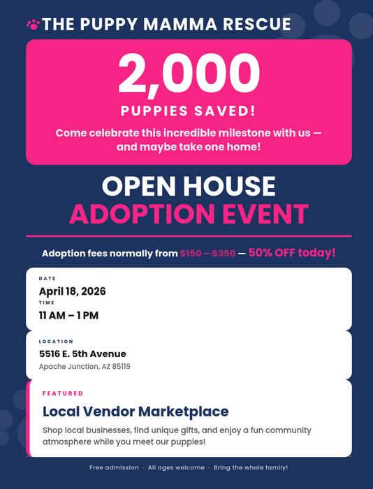 All puppies are up to date on vaccines, spayed or neutered and microchipped. Our puppy adoption fees range from $150 to $400. If you are interested in adopting any of the dogs you see on here please email Sandy@ThePuppyMamma.com or call 480-688-6969 to schedule an appointment.